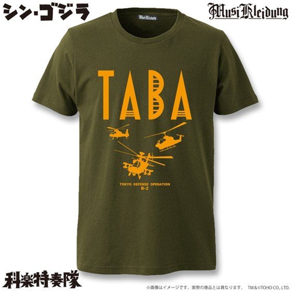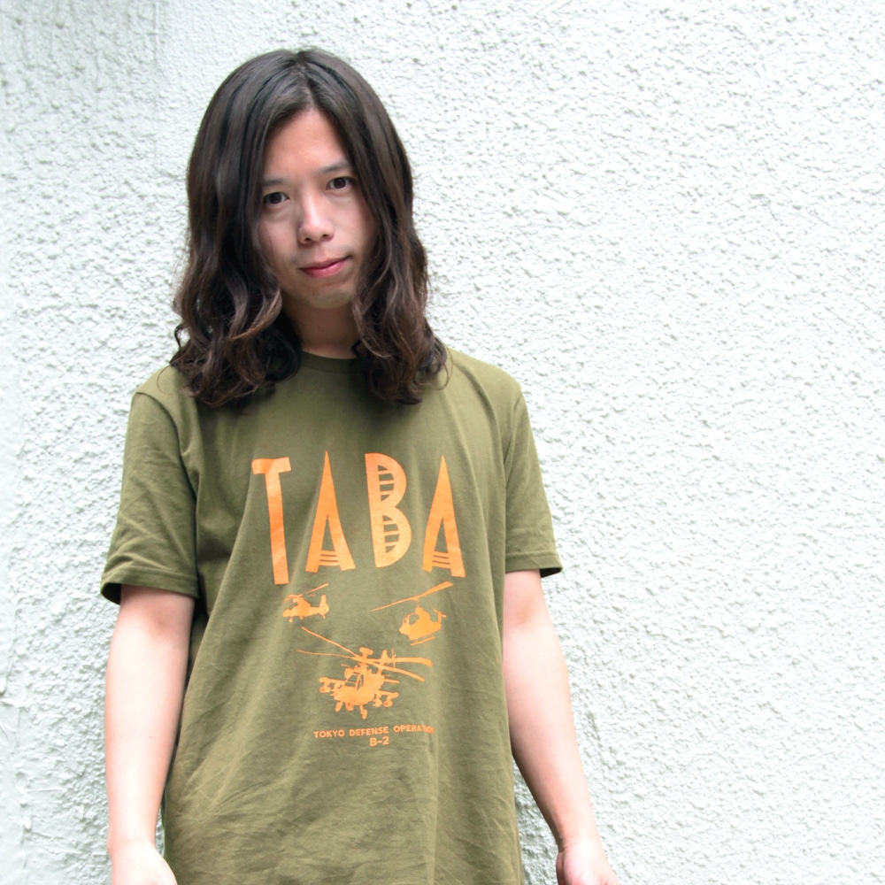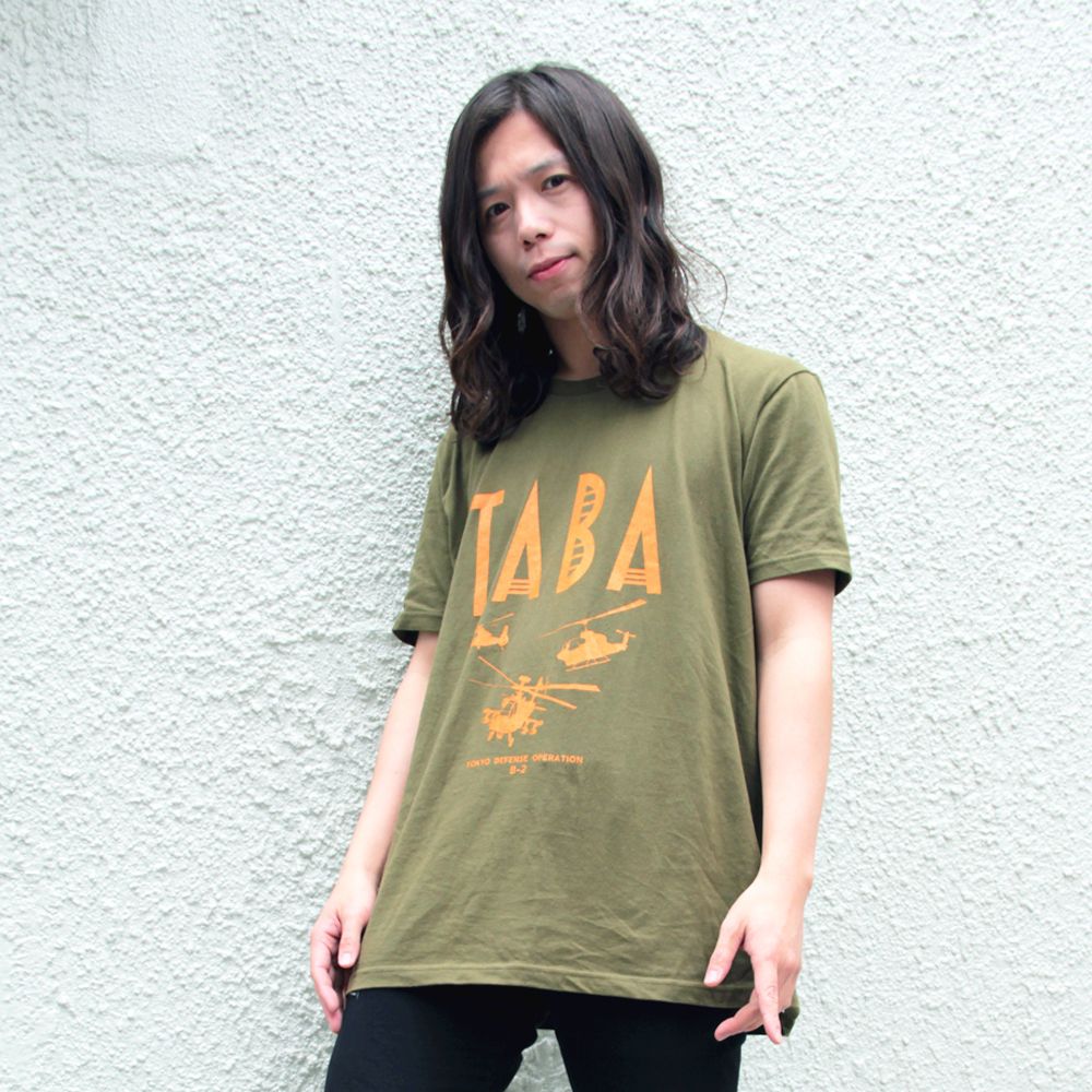 「TABA」のロゴに戦闘ヘリのシルエットがアーミーなイメージを醸し出し「TOKYO DEFENSE OPERATION B-2」の文字がさりげないワンポイントに。「TABA」ロゴの「B」は劇中に登場する丸子橋のイメージなのもポイント。