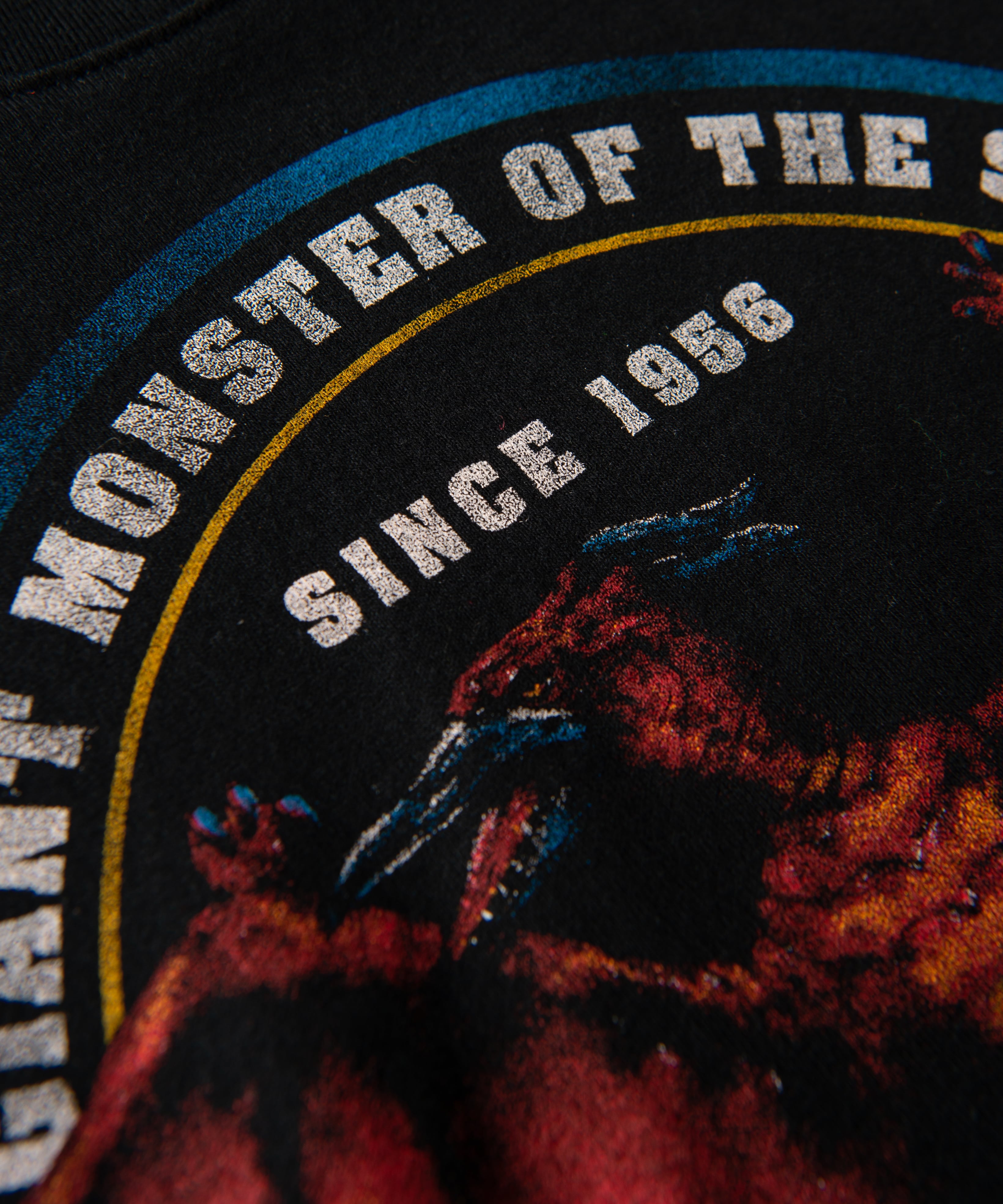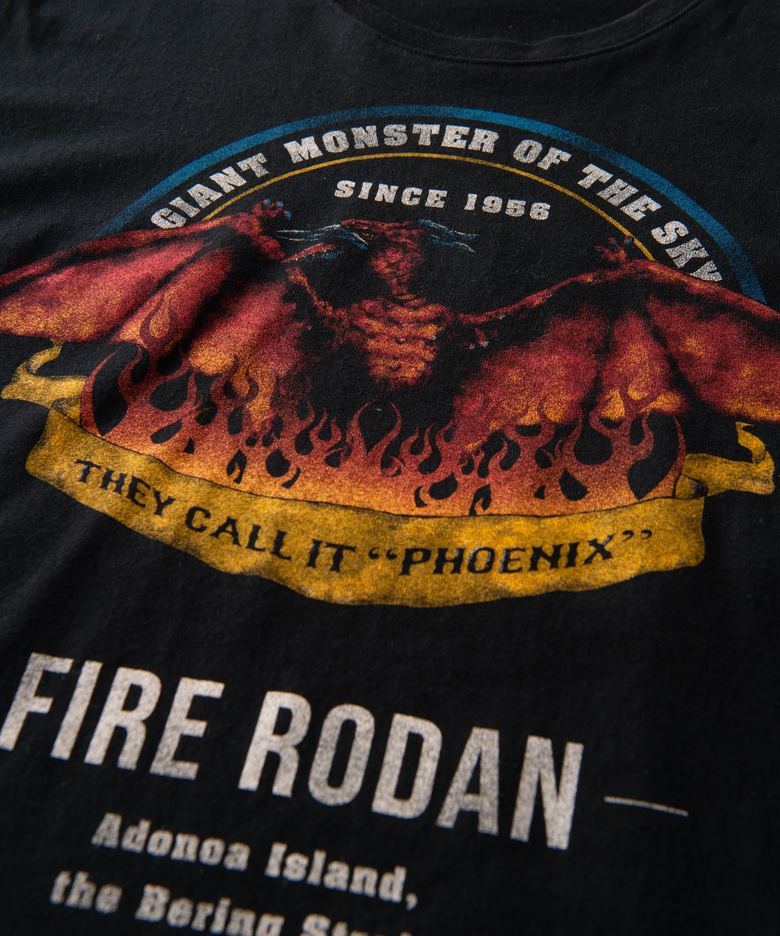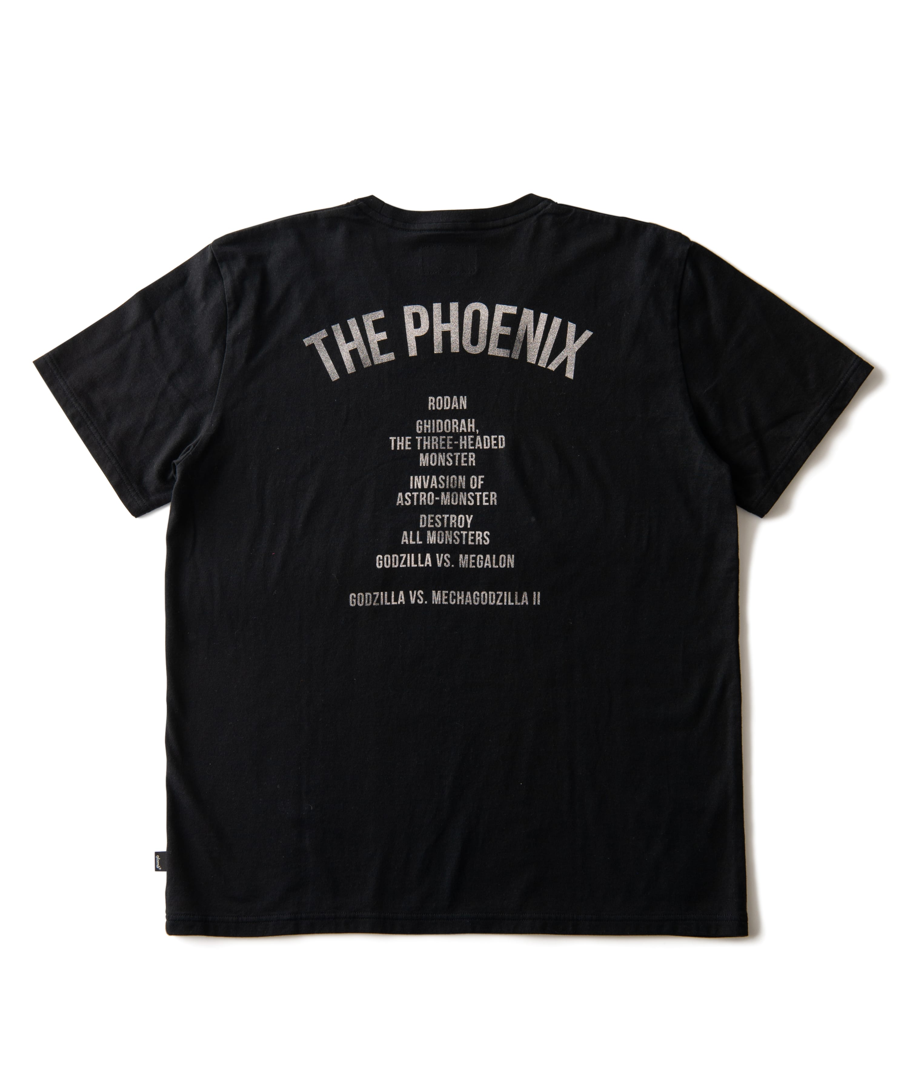 ゴジラに次いで登場回数が多く、シリーズによって姿形を変える怪獣・ラドン。『ゴジラvsメカゴジラ』における形態「ファイヤーラドン」を、モーターサイクルやスケーターカルチャーの意匠からインスピレーションを得た構図に描き出しました。フロントにはグラフィックのムードを盛り立てるよう海外における異名“PHOENIX”や出身地をプリント。バックスタイルにはこれまでに登場した作品の数々をあしらい、ロックなムードもまとわせました。