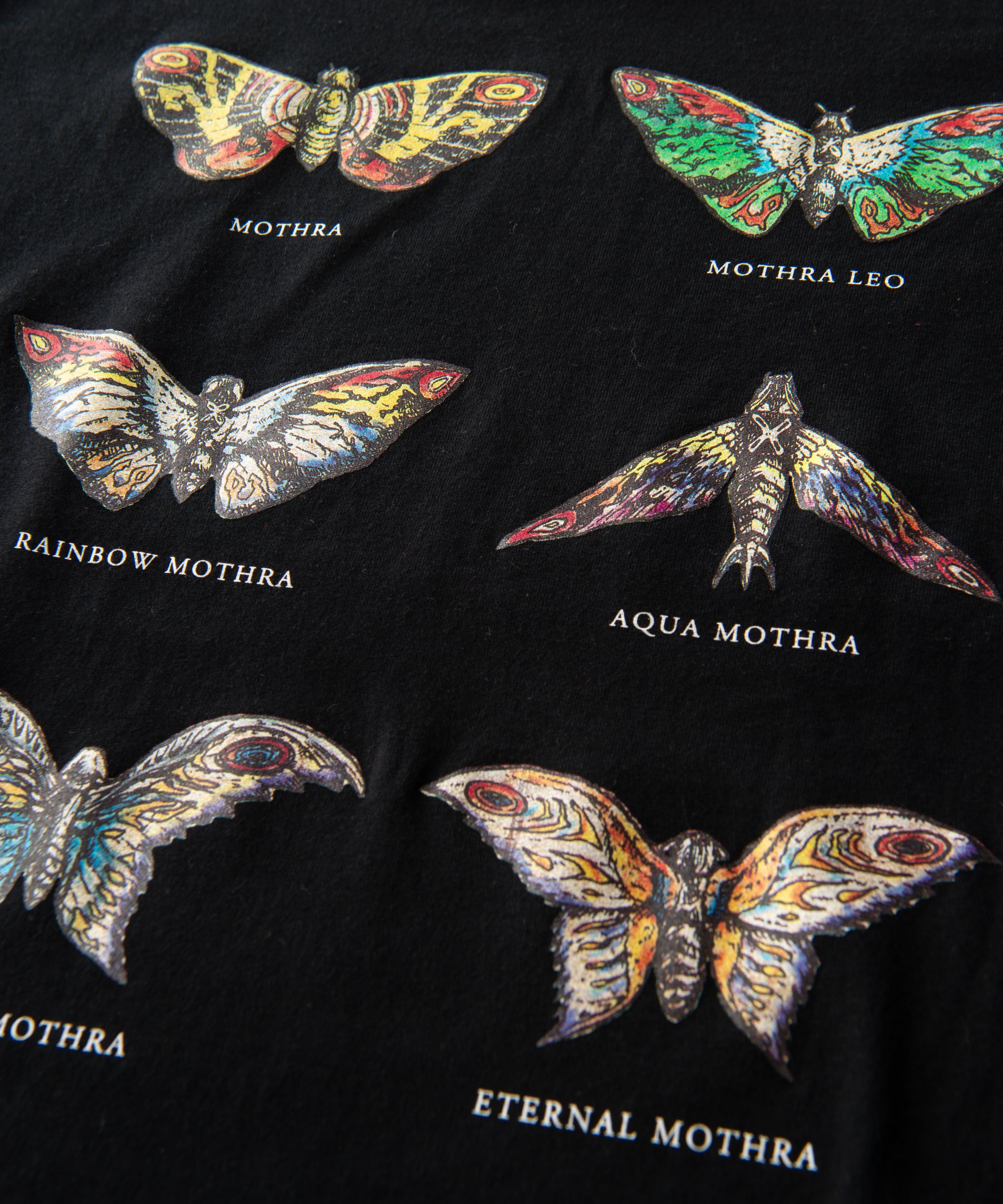 『ゴジラ』シリーズの中でも屈指の人気を誇り、唯一正義の怪獣として描かれるモスラ。コンテンポラリーアートに見られるモチーフの配置をソースに、羽根の模様や色合いにフィーチャーした6形態のグラフィックをフロントにあしらいました。それぞれの意匠の下には“RAINBOW MOTHRA”“AQUA MOTHRA”など、形態名をエレガントなフォントで配置。強敵を打ち破るために新たな能力を身に着けていく変化の歴史をストリートウェアでお楽しみください。