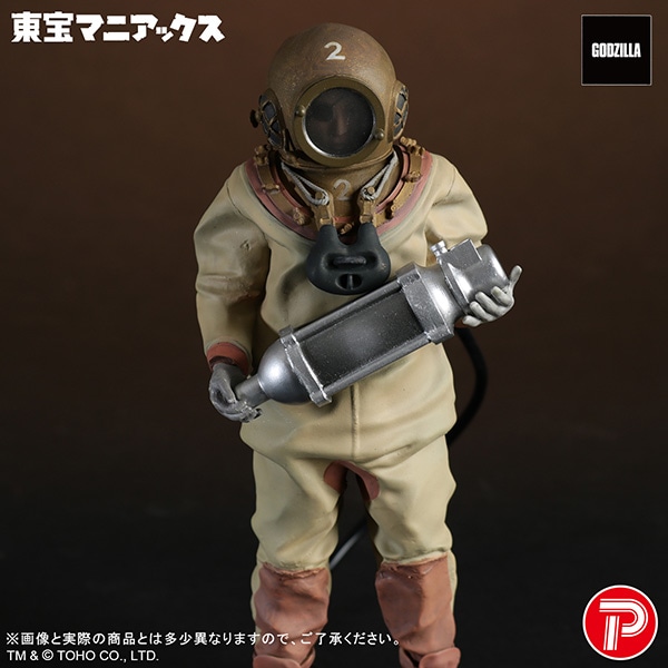 オキシジェン・デストロイヤーを抱え、ゴジラが潜む海底へ向かう覚悟を決めた姿を造形。