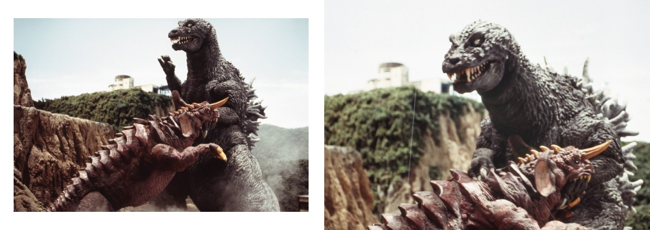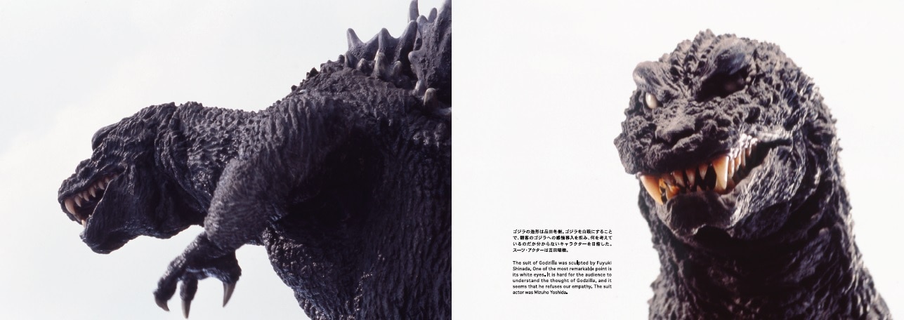 本書の”ゴジラ”は、映画『ゴジラ・モスラ・キングギドラ 大怪獣総攻撃』(2001)に登場しました。撮影時のスナップとスチールで、その造形をお楽しみ下さい。