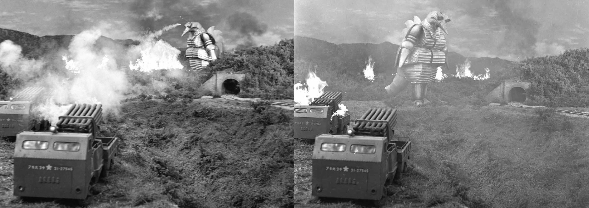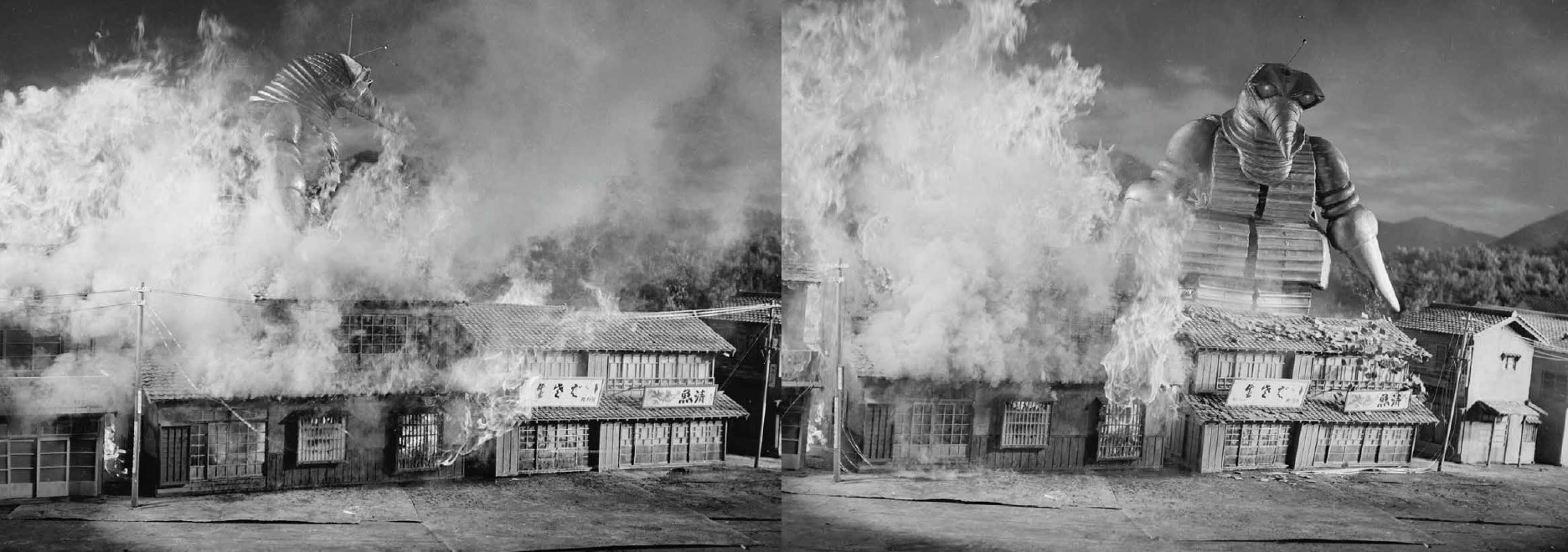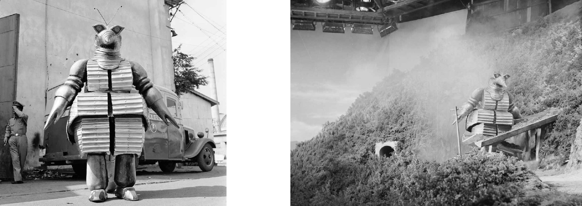 In this volume we take a closer look at the giant alien robot Moguera, which first appeared in THE MYSTERIANS (1957). Created by the Mysterians, Moguera works as a kind of heavy construction machine, an earthmover used by the aliens to reshape the Earth’s landscape for their own purpose. It also functions as a weapon in their invasion force. The first giant robot monster to appear in a Toho Special Effects film, Moguera’s design is both unique and memorable.We hope you enjoy the brave figure with these snapshots and still picture taken during the shooting of the film.