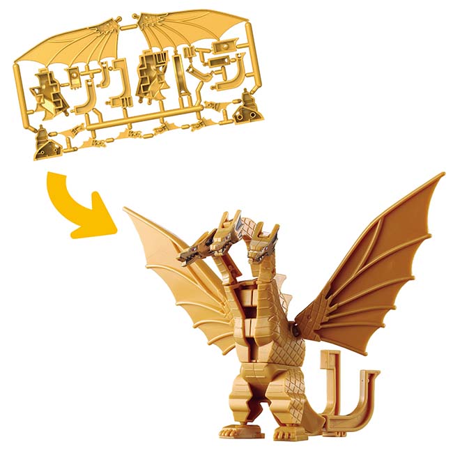 プラキットのランナーに「キングギドラ」の名前上にパーツが配置されており、ランナーからパーツを切り離して組み立てるとキングギドラのフィギュアが完成!