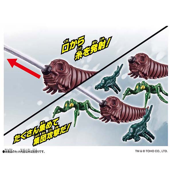 特徴的なギミックや可動が搭載されており、「モスラ(1992)幼虫」には、糸の伸縮ギミックを搭載!