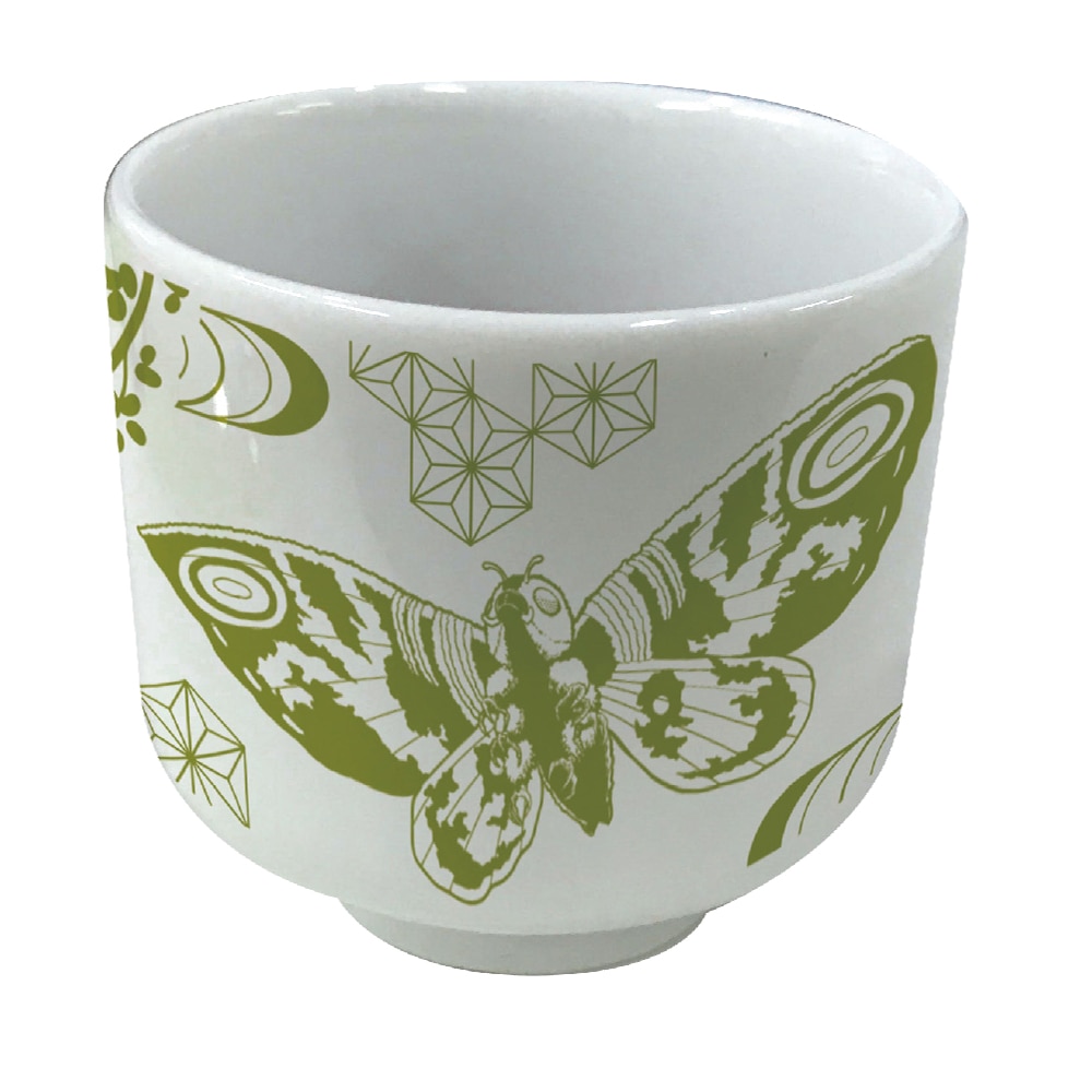 モスラと華やかな和柄がデザインされたおちょこ。小ぶりの大きさで蛇の目柄入り!