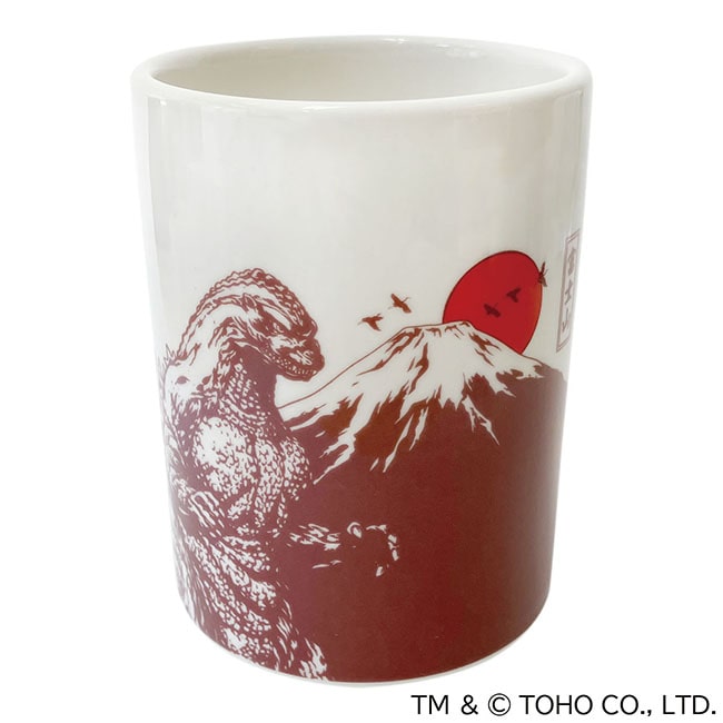 赤富士と日の丸を背にしたゴジラがデザインされた湯呑です