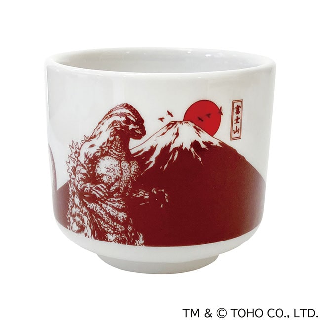 赤富士と日の丸を背にしたゴジラがデザインされた御猪口です