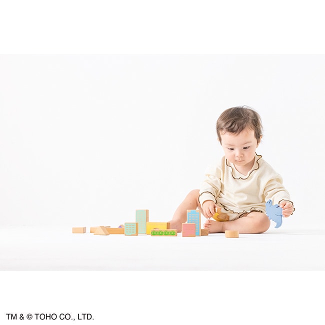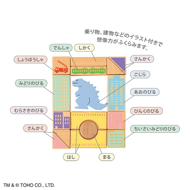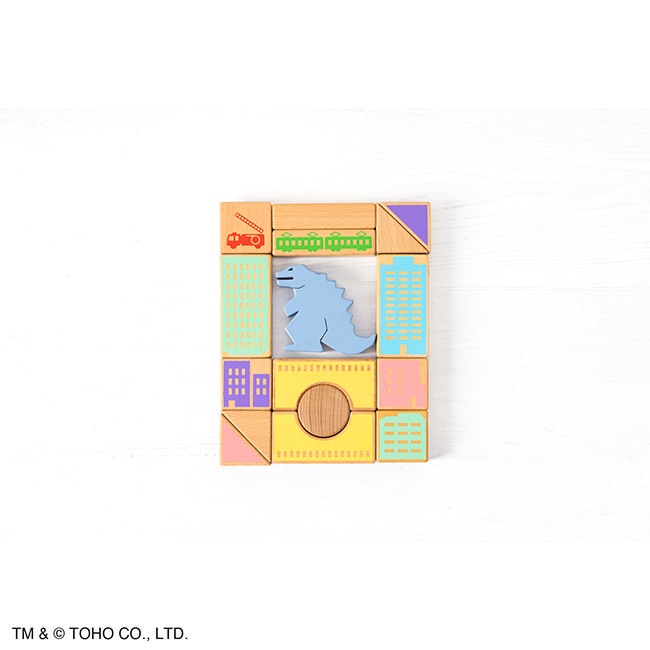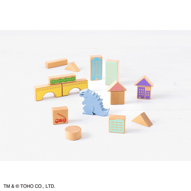 「ゴジラつみき」とビル、電車、橋などの街並みを作れるパーツも入った全16ピース。