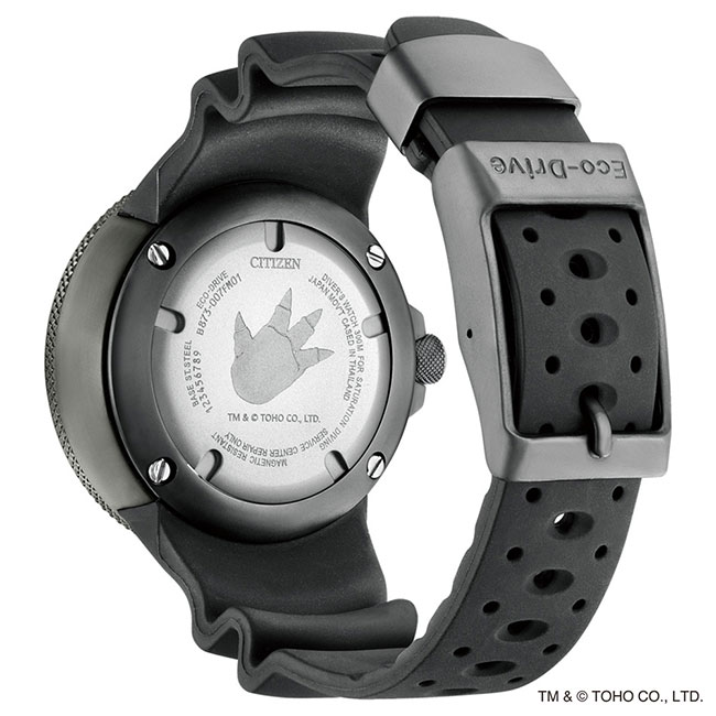 ケースバックには、コラボの証としてゴジラの足跡を模した刻印。文字板カラーは、ゴジラの胴体をイメージしたブラック、エネルギーが活性化し憤怒したゴジラをイメージしたダークレッドの2タイプです。