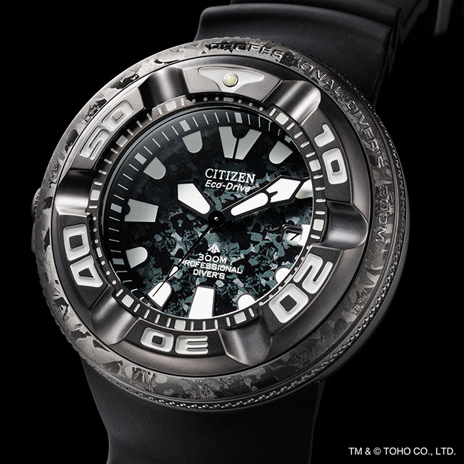 日本が生んだ世界に誇る怪獣「ゴジラ」とプロマスターがコラボ。過酷な環境下でも使える堅牢性と視認性を備えた飽和潜水仕様のスペック、プロマスターらしい無骨なデザインを生かした限定モデルです。