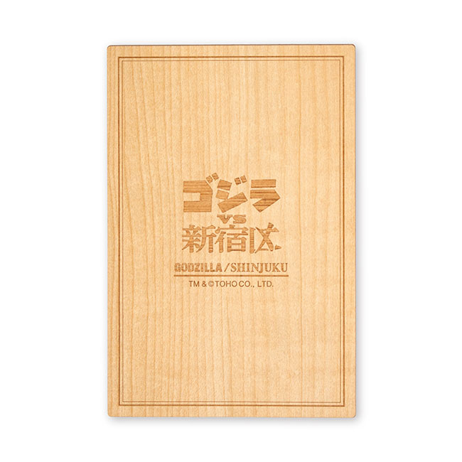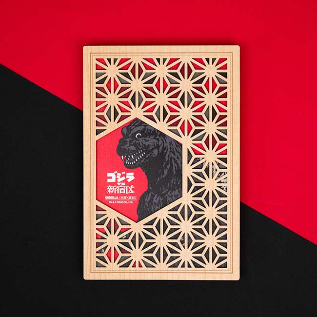 レーザーカットされた繊細な和の意匠の中にゴジラが大胆に描かれた、オリジナルデザインの木の表紙の集印帳です。