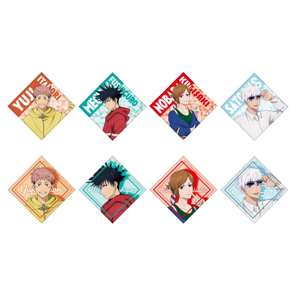 「虎杖悠仁、伏黒 恵、釘崎野薔薇、五条 悟」のTaS限定「私服」描き下ろしイラストを使用。各キャラクター2種類ずつデザインした、全8種類をランダム3個セットにしてお届けいたします。