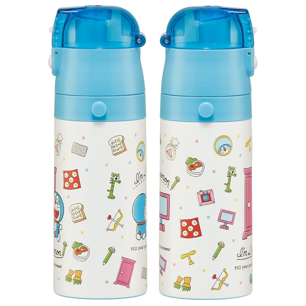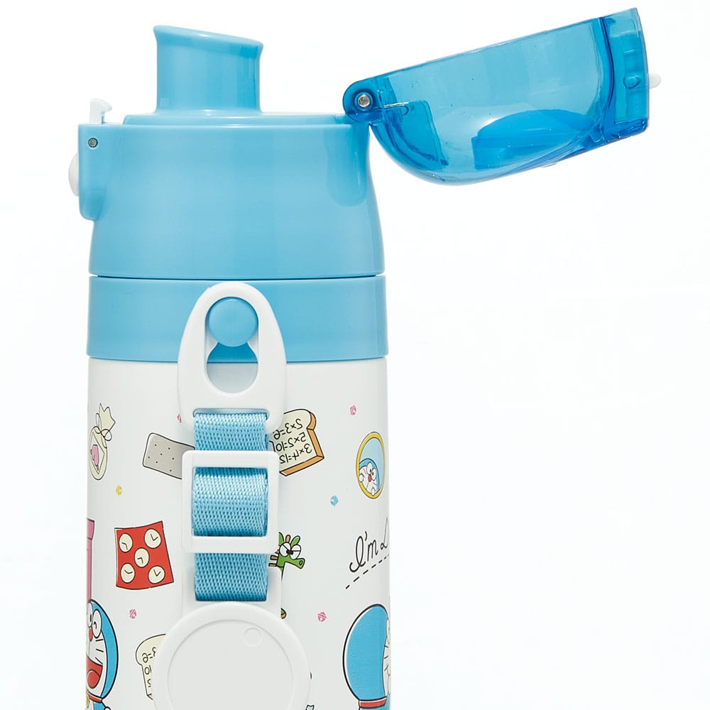 氷が入れやすいワイド口径。ネームプレート付きのショルダーベルト&お名前シール付き。見つけやすいカラーパッキン仕様。