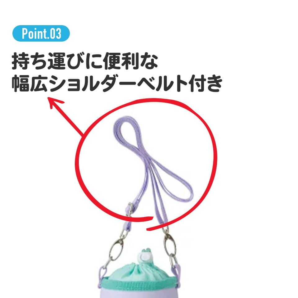 持ち運びに便利な幅広ショルダーベルト付き。色々なサイズに対応。