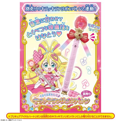 別売りの「くるくるまわして♪キラッキランリボンバトン」にセットして、映画だけの特別なキメ技をはなとう キラキライトはボタンを押すと光ります。