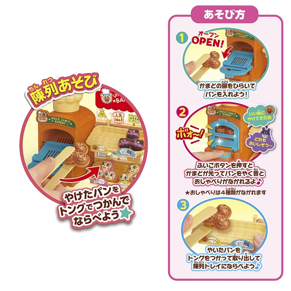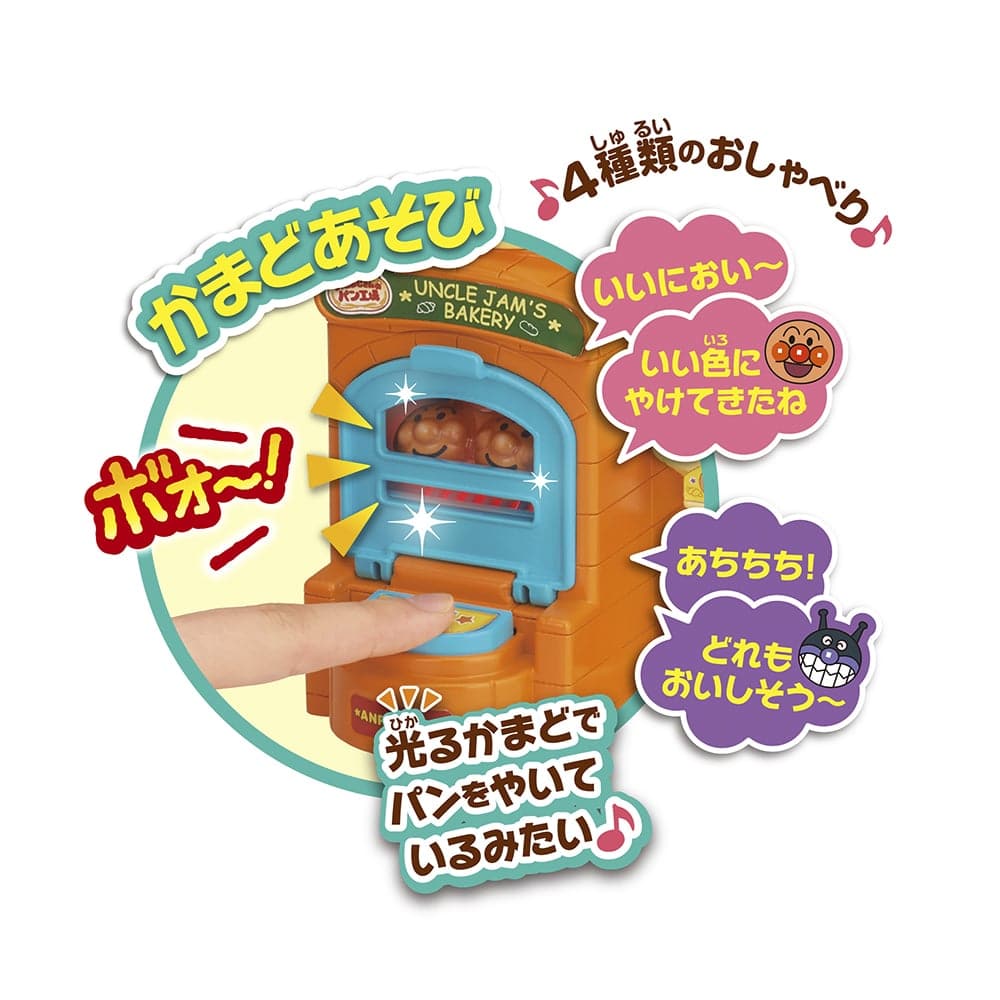 3.ふいごボタンを押すと、かまど内のLEDが光ってボォ~!というパンの焼ける音とアンパンマンとばいきんまんのおしゃべりが流れるよ♪