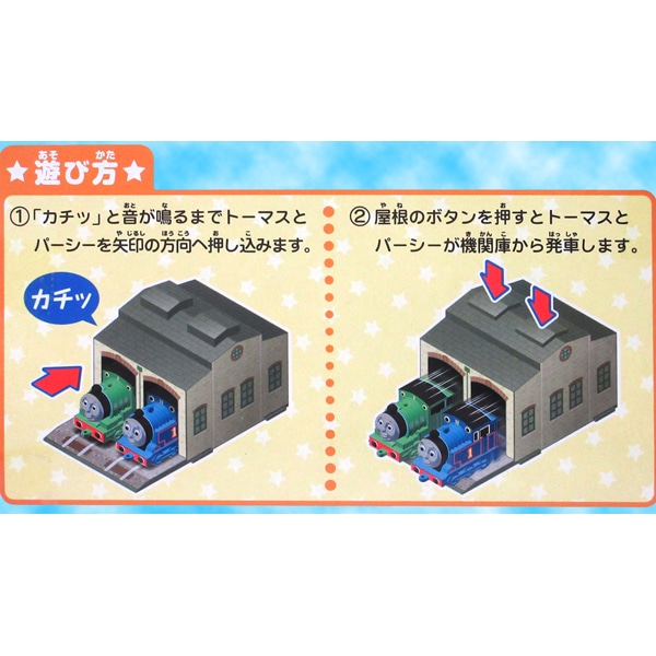 トーマスとパーシーは「トーマスの7両連結セット」と同じ物を使っているので「きかんしゃトーマス7両連結セット」に入っている車両は全て この機関庫で発車させて遊べるようになっています。