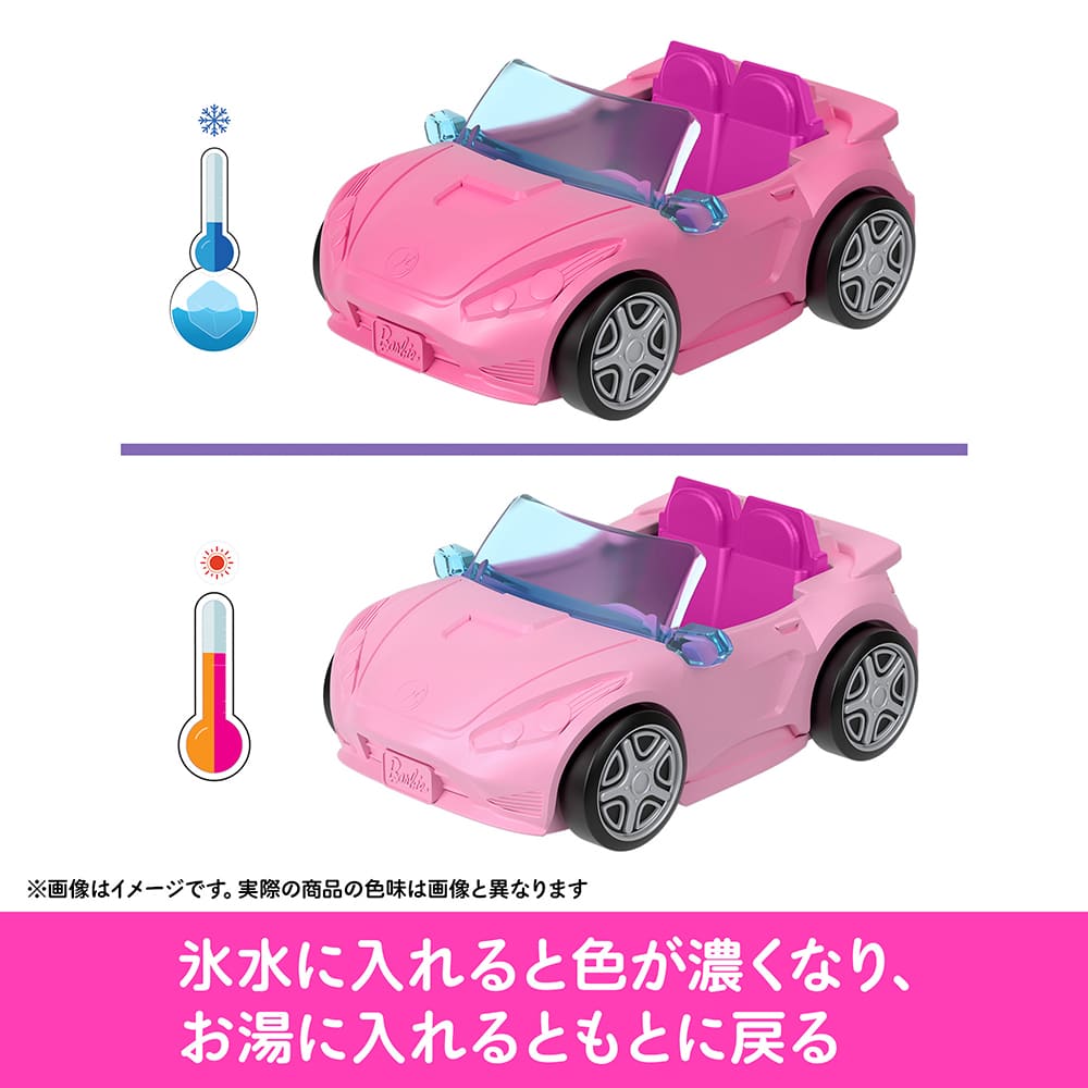 コンバーチブルは、付属のマイクロドールやミニバービーランドのマイクロドールを乗せることができ、氷水に入れると濃いピンク色に、お湯に入れると薄いピンク色に戻ります。