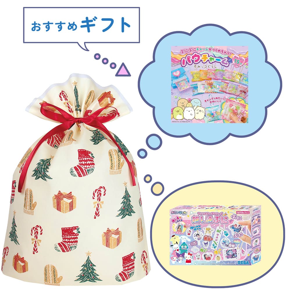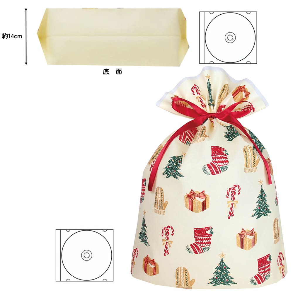 ソックスやツリーなどクリスマスモチーフが描かれた賑やかなギフトバッグです。