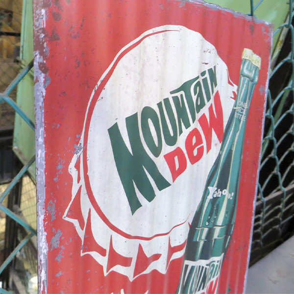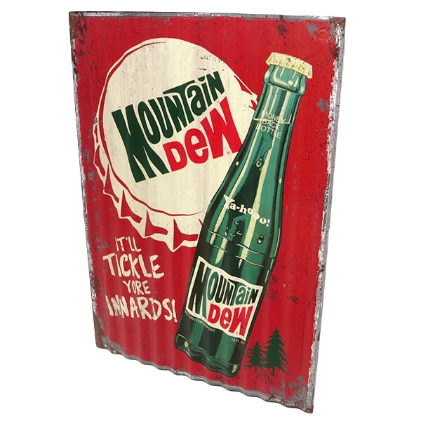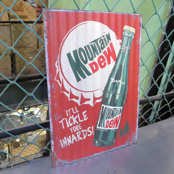 とたん板のようなナミナミの形状と材質のMOUNTAIN DEW マウンテンデューのコルゲートメタルサインです。