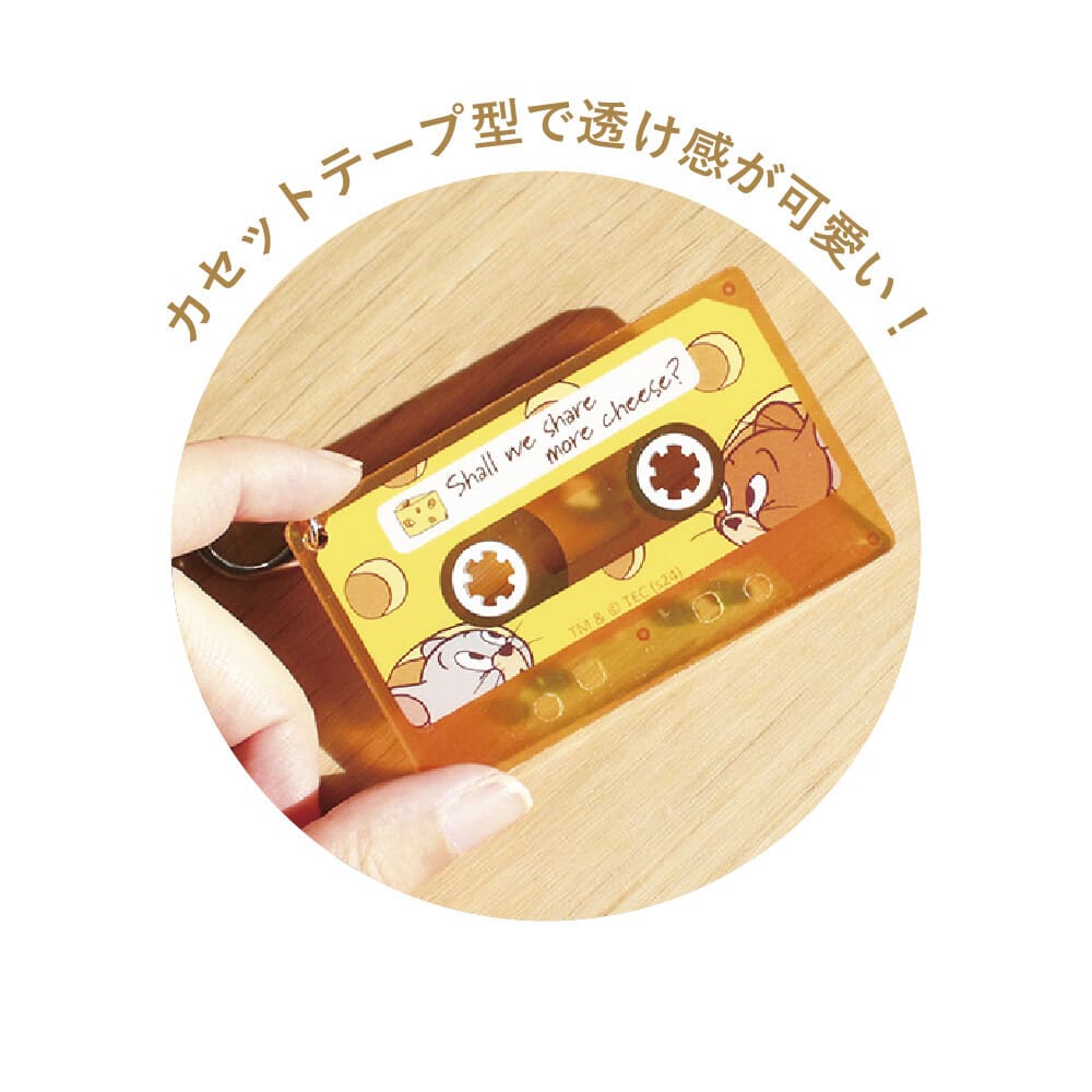 トム&ジェリーのキャラクターたちがデザインされたカセットテープ風キーホルダー。