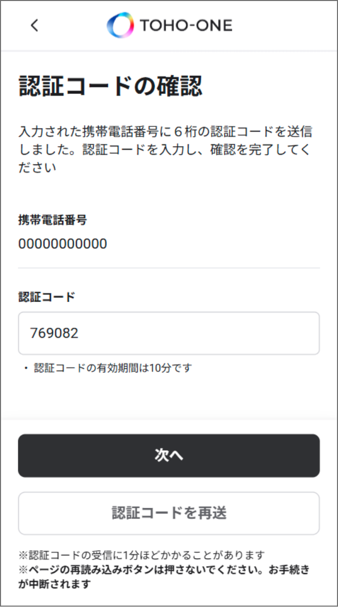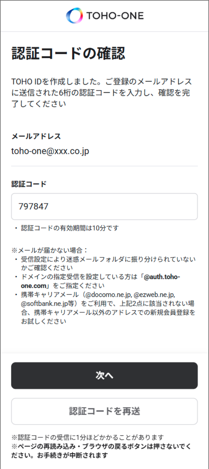 2で入力したメールアドレスに届いた認証コードを入力し、次に進んでください。